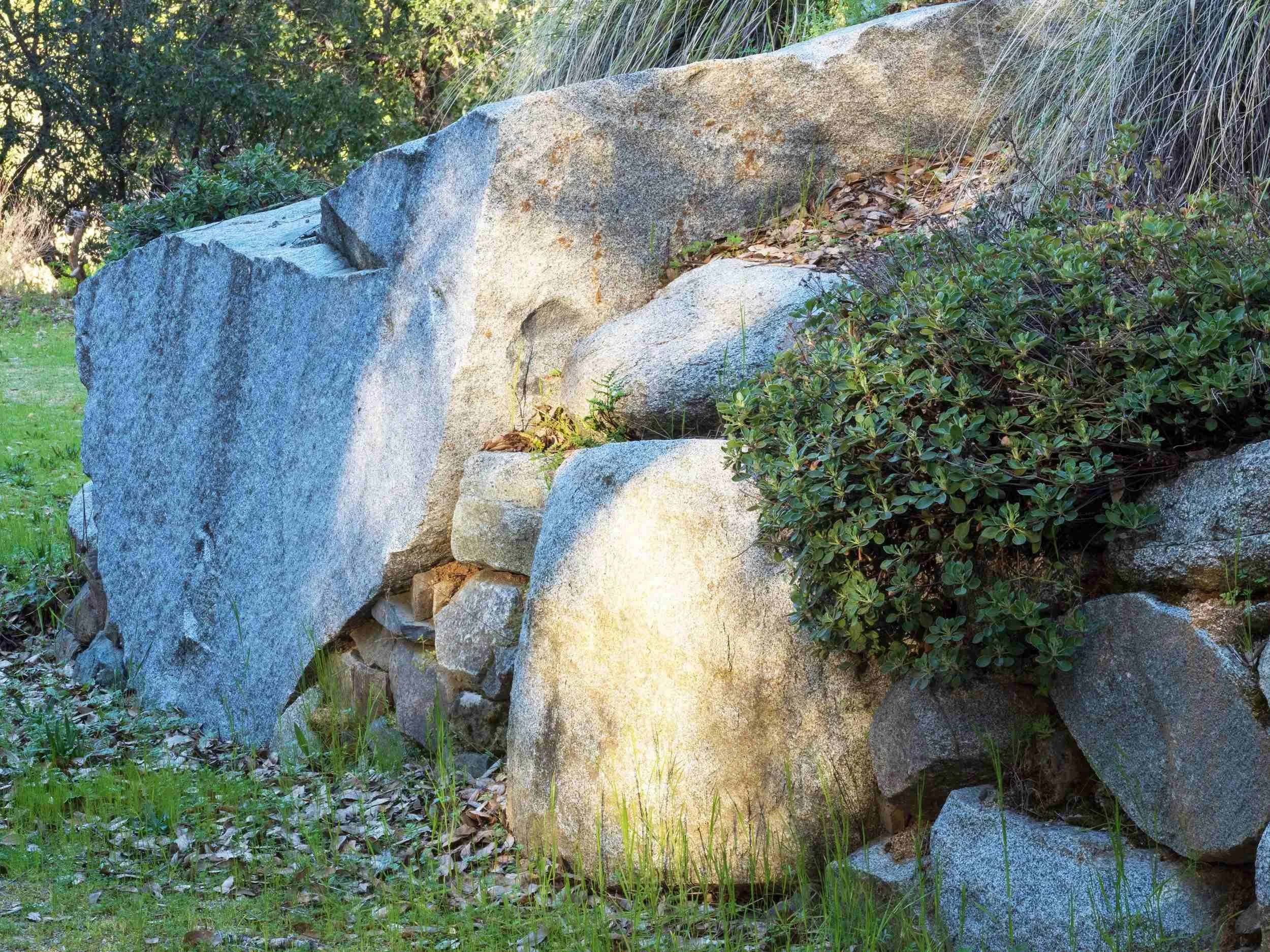 When it was clear that we would need enough boulders for an 80’ retaining wall, we convinced the owner of the local gravel quarry to give us all of his that were in the way of his operation. Other than the cost of transport and constructing the wall, these boulders — some car sized — were free.